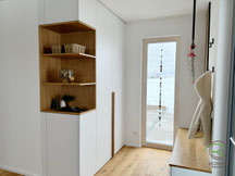 Seitlich integriert ist ein offenes Eichenregal, das von vorne nicht sichtbar ist. Hier können alle Familienmitglieder Mützen, Handschuhe oder kleine Alltagsgegenstände griffbereit verstauen – unsichtbar für Besucher, aber sofort erreichbar.