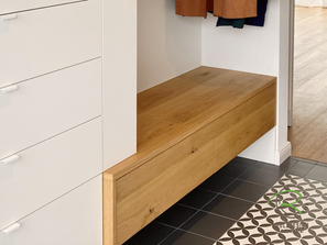 - vorgezogene grifflose Garderobenbank mit Frontüberstand