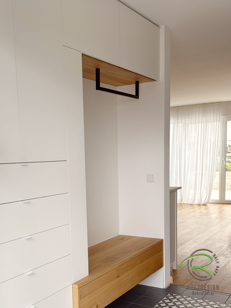 Jeder Eingangsbereich hat andere Maße und jede Familie andere Gewohnheiten. Eine maßgefertigte Garderobe nutzt den vorhandenen Raum deshalb bis auf den letzten Zentimeter. Dieses Projekt in der Nähe von Radolfzell am Bodensee zeigt, wie sich individuelle Ideen für Stauraum und Komfort perfekt umsetzen lassen – selbst wenn die Nische nicht die üblichen 600 mm Tiefe erreicht.