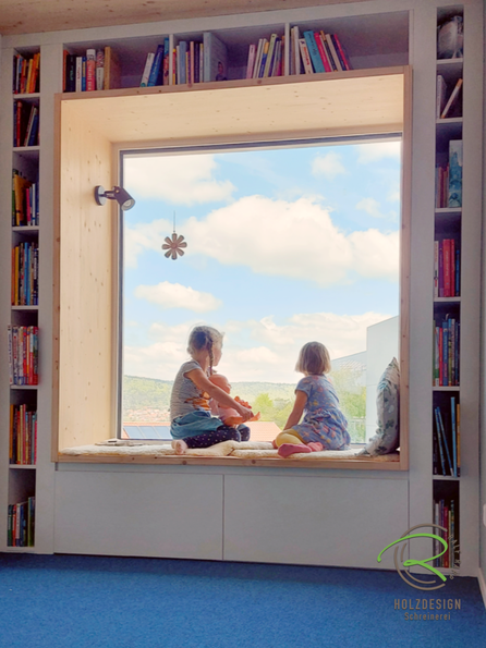 Hier wurde die Wandöffnung im Raster der Ständerkonstruktion geplant & das Sitzfenster als maßgefertigtes Möbelstück eingesetzt. Der Rahmen wurde aus Fichte 3-Schichtplatten mit Massivholzanleimer hergestellt & Ständerwände mit MDF-Schichtstoff verkleidet